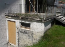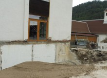 Nach dem Abbau der Gerüsttreppe wurde die Marode Terrasse mit den darunter liegenden seit Jahren nicht mehr benutzbaren Toiletten abgerissen. Anschließend mussten noch zwei Abwasserrohre neu verlegt werden bevor die Wand gedämmt und die offenen Mauerstellen verputzt wurden.